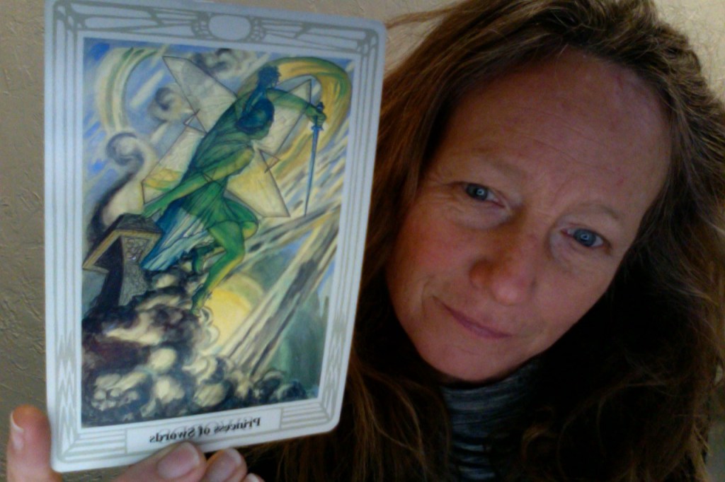 The Princess of Swords is a warrior against the dark forces of negative thinking. Angeles Arrien calls her the “mood fighter”. She rises above the dark clouds of negative thinking and uses practicality to cut through the fog of despair so that the light can shine through. She is also showing us the strength required to fight off the negative effects of other people’s moods and their effects on us. Are we working against someone else’s negative energy? Are our thought patterns obscuring our vision?