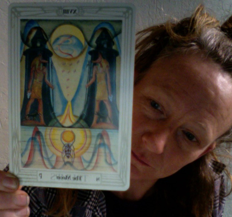 Lunacy! Insanity! We will turn into wild animals! We will never return! We will be committed and put away forever! These fears are real. It is very difficult and painful to step out of a carefully constructed reality. It is a painful process to strip off all the ego protections and benefits of fitting in, or at least appearing to. In this card, you can see the two guardians of the gate – they are the Ra Kings of ancient Egypt, the Sun Gods. They will protect us as we enter into the process of dismantling the ego. The jackals who stand at their feet can sniff out any remnants of the old self that we are tempted to try to sneak into the other side. They are the bullshit detecting dogs!
