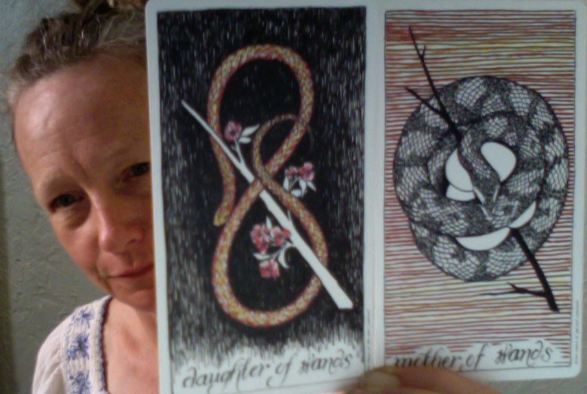 Using snakes as the Wand family gives them a certain sexual tone which adds to the feminine power of these cards. As the daughter seems to be guarding her own innocence, the mother is working through the other side of her sexual power in mothering her eggs.