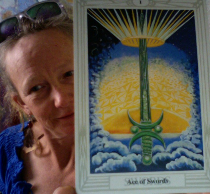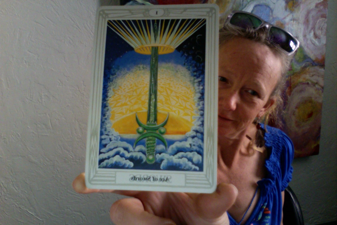 Ace of Swords sums it up like no other card. Here we have a card in the realm of air- the mind, the intellect, communication. The crown on top of the sword represents divine insight – literally a higher mind experience as information pours in through the crown chakra. This is a state of clarity and openness to new ideas. The green sword represents the importance of creative thinking. This is essential to the AHA experience that we seek at times when our old ways are not serving us and new ways are unclear…yet.