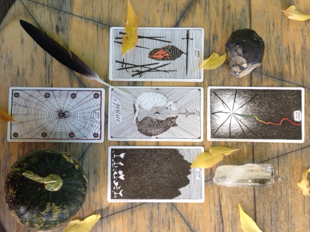 8 of Pentacles is a lovely fall symbol of the spider spinning her web. She is creating a fully balanced work of art that has a very practical purpose. This is an expression of her nature, and it is truly a symbol of life, death and creative expression.