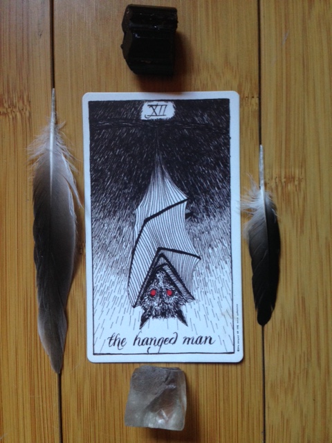 In our regular, unconscious routines of going about life, we imagine that we alone are fully responsible for everything we create and experience. While it is good to be able to take personal responsibility for one’s life, it is also very important to remember that we are co-creators of life – with life. Life is alive. If we are able to dance with the forces of life, we can achieve much more than we could all on our own. Without awareness of the forces of life, or the Divine or God, we imagine we have to force everything in a constant experience of efforting. Our egos believe this is the only way. This red eyed bat (has he been having some insomnia?) comes to say – Hey Lady! Hang your ego upside down! Hang your ego to dry! Turn your ego on its head! The ego is not going to be the one who leads us to true freedom or glory. The hanged man says – Tune in! Turn on! Turn upside down! (for now) There is a feeling of limitation. A feeling of being bound. This can make us very restless or irritated or depressed. It is time to surrender our ideas of power and control, and allow our own inner faith and trust to develop.